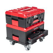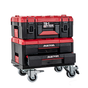 Shuter Mobile Toolbox (2) Stackable Kit with (TB-1) w/ tray, ABS high rigidity anti-impact design, Quick Release Side Latch, Dual handles top and side, (TB-2D) w/ (2) Drawers, Ball bearing drawer slides built for heavy loads, ABS high rigidity anti-impact design , Dividers and EVA Pad, Mobile Base for Stackable Tool Boxes (TB-1 ~ TB-2D) 3″ Polypropylene Industrial swivel – braking Casters. Load capacity 300 lbs