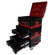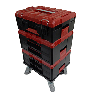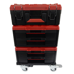Shuter Mobile Toolbox (3) Stackable Kit with (TB-1) w/ tray, ABS high rigidity anti-impact design, Quick Release Side Latch, Dual handles top and side, 2 Each (TB-2D) w/ (2) Drawers, Ball bearing drawer slides built for heavy loads, ABS high rigidity anti-impact design , Dividers and EVA Pad, Mobile Base for Stackable Tool Boxes (TB-1 ~ TB-2D) 3″ Polypropylene Industrial swivel – braking Casters. Load capacity 300 lbs